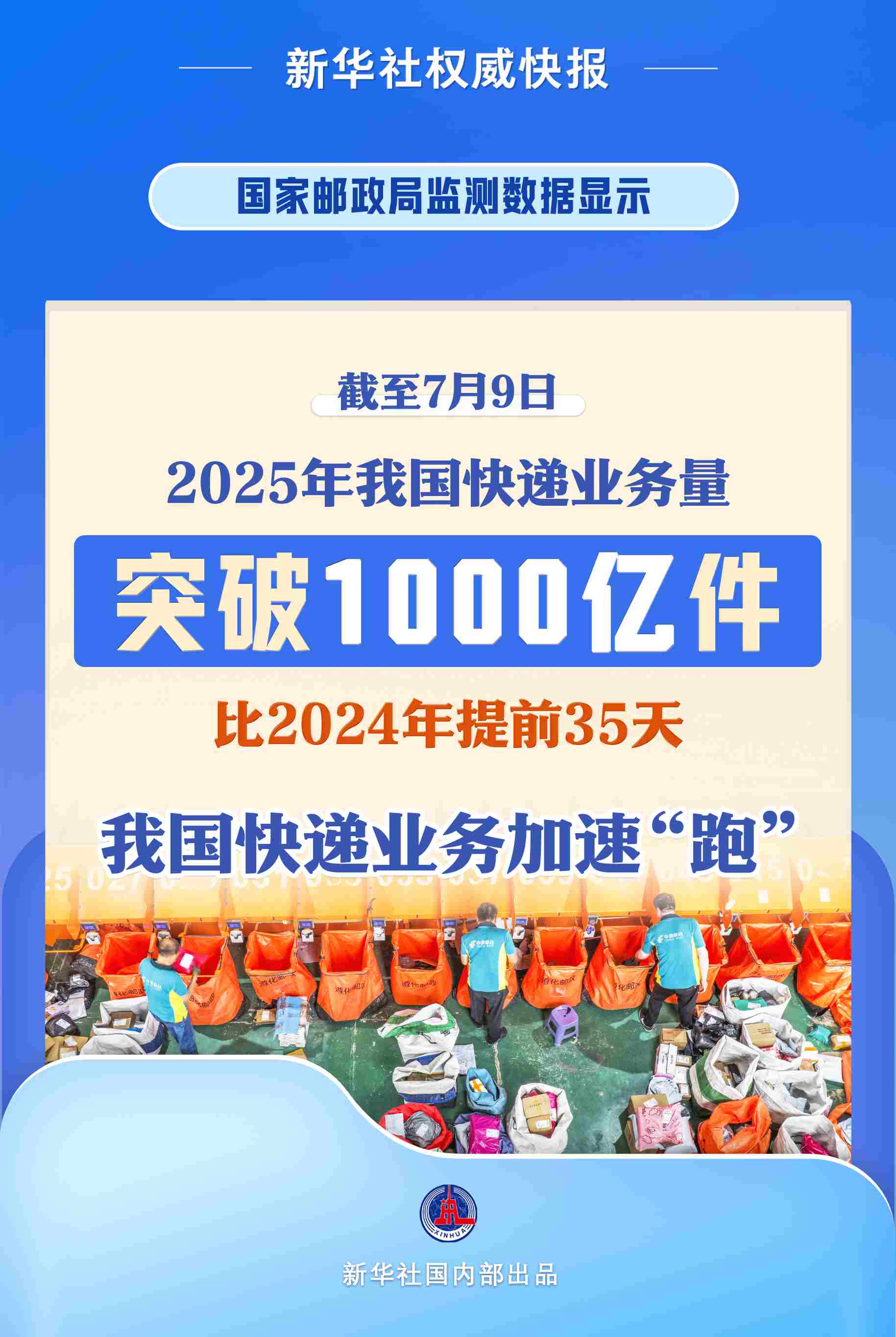 新華社北京7月10日電(記者葉昊鳴)記者10日從國(guó)家郵政局了解到,根據(jù)國(guó)家郵政局監(jiān)測(cè)數(shù)據(jù)顯示,截至7月9日,2025年我國(guó)快遞業(yè)務(wù)量突破1000億件,比2024年達(dá)到千億件提前35天。