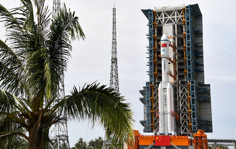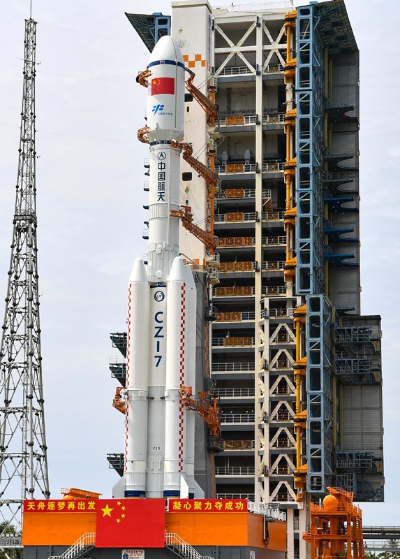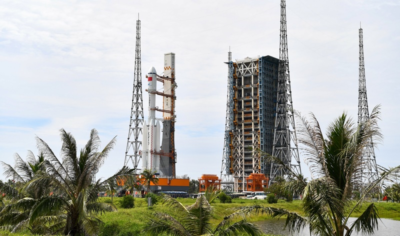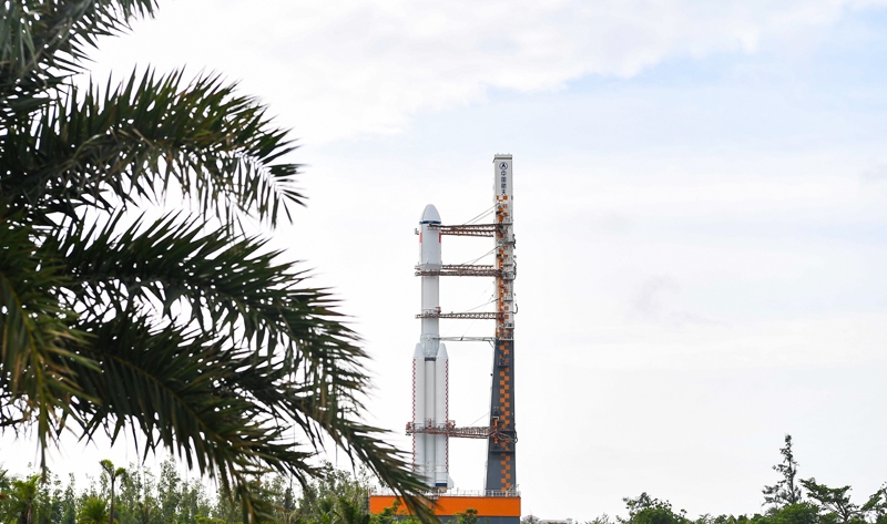 7月12日,天舟九號(hào)貨運(yùn)飛船與長征七號(hào)遙十運(yùn)載火箭組合體垂直轉(zhuǎn)運(yùn)中。