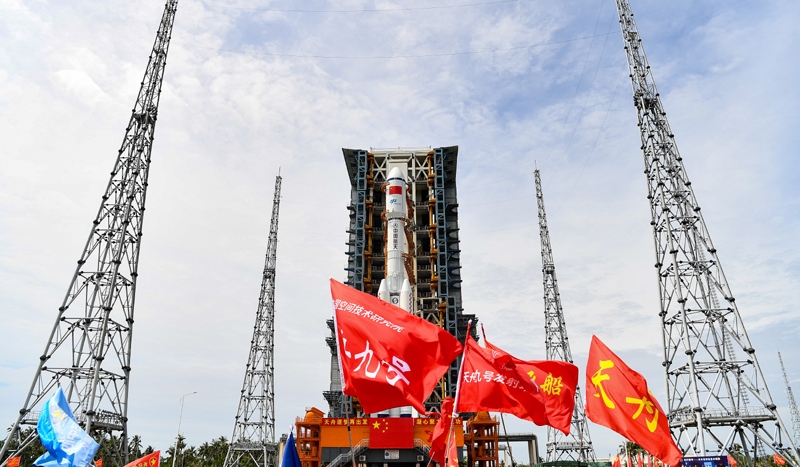 7月12日,天舟九號(hào)貨運(yùn)飛船與長征七號(hào)遙十運(yùn)載火箭組合體垂直轉(zhuǎn)運(yùn)至發(fā)射區(qū)。