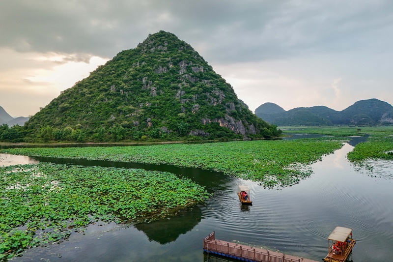 盛夏時節(jié),云南省文山壯族苗族自治州丘北縣普者黑景區(qū)內(nèi)萬畝荷花初綻,碧葉連天,與獨特的喀斯特峰林、清澈湖泊繪就一幅獨具特色的山水畫卷,吸引八方游客紛至沓來。