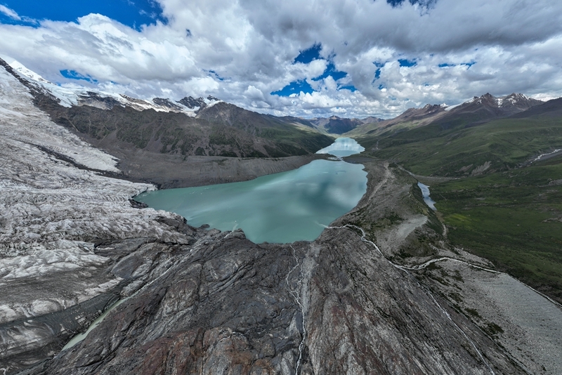 7月19日拍攝的薩普雪山及延伸的冰川(無(wú)人機(jī)照片)。