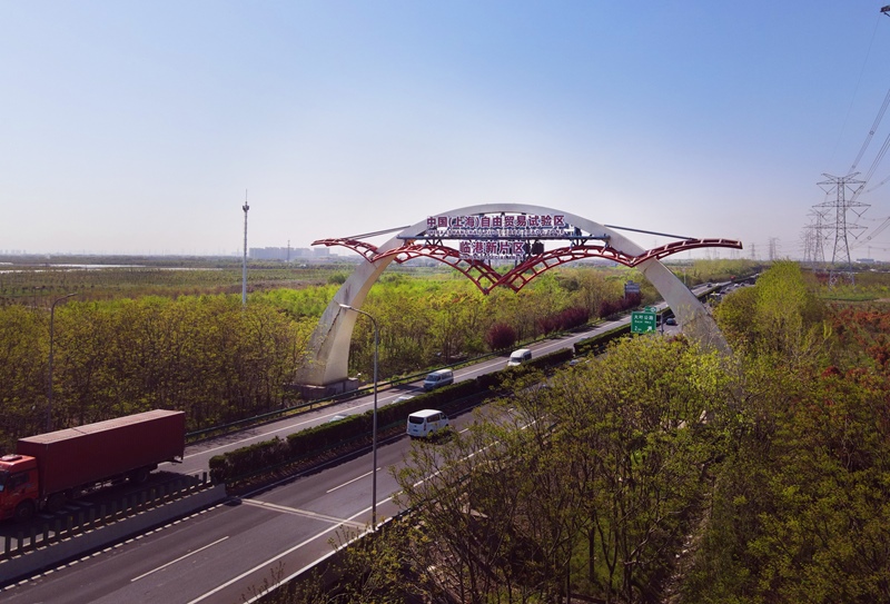 2025年4月15日拍攝的位于滬蘆高速公路上的上海自貿(mào)試驗(yàn)區(qū)臨港新片區(qū)的標(biāo)志“海鷗門”(無人機(jī)照片)。新華社記者 方喆 攝
