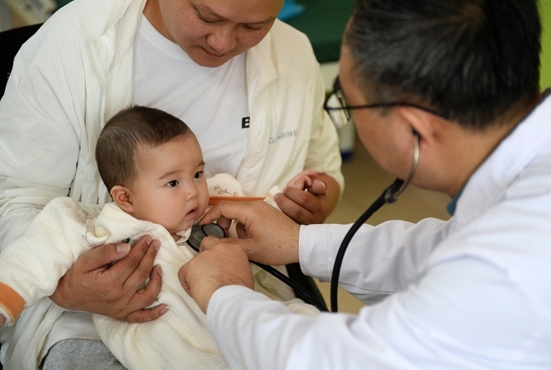 在貴陽(yáng)市觀山湖區(qū)婦幼保健院,參加“天使之旅——先心病患兒篩查救助行動(dòng)”的山東第一醫(yī)科大學(xué)附屬中心醫(yī)院醫(yī)療專(zhuān)家在為孩子做檢查(2025年4月22日攝)。新華社記者 劉勇貞 攝