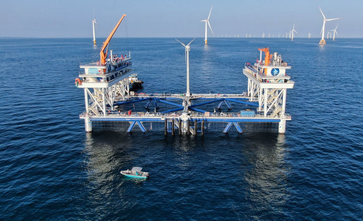這是在廣東汕尾拍攝的中廣核“伏羲一號”風漁融合網(wǎng)箱平臺(2024年9月2日攝,無人機照片)。新華社記者 鄧華 攝