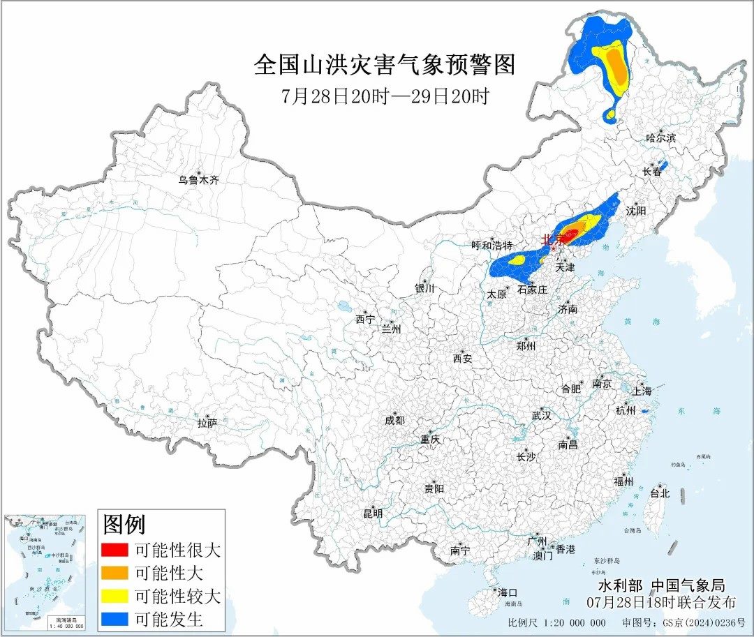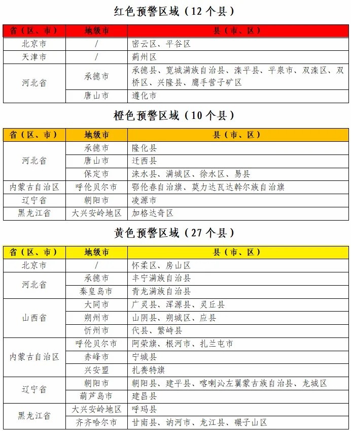 據(jù)“中國(guó)水利”微信公眾號(hào)消息,水利部和中國(guó)氣象局7月28日18時(shí)聯(lián)合發(fā)布紅色山洪災(zāi)害氣象預(yù)警:預(yù)計(jì),7月28日20時(shí)至7月29日20時(shí),北京東部、天津北部、河北中部和東北部、內(nèi)蒙古東北部、遼寧西部、黑龍江西部等地部分地區(qū)發(fā)生山洪災(zāi)害可能性大(橙色預(yù)警),其中,北京東部、天津北部、河北東北部局地發(fā)生山洪災(zāi)害可能性很大(紅色預(yù)警),預(yù)警區(qū)域涉及的縣(市、區(qū))見(jiàn)下表。其他地區(qū)也可能因局地短歷時(shí)強(qiáng)降水引發(fā)山洪災(zāi)害,請(qǐng)各地注意做好實(shí)時(shí)監(jiān)測(cè)、防汛預(yù)警和轉(zhuǎn)移避險(xiǎn)等防范工作。
