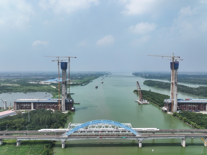 這是8月5日拍攝的滬渝蓉高鐵跨京杭運(yùn)河斜拉橋建設(shè)現(xiàn)場(chǎng)(無人機(jī)照片)。