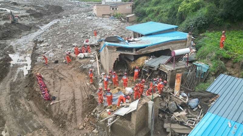 8月10日,國家西北區(qū)域應急救援中心救援人員在甘肅省榆中縣馬坡鄉(xiāng)舊莊溝村全力搜救失聯人員(無人機照片)。