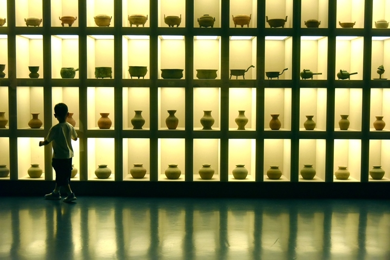 8月10日,家長帶著孩子在甘肅省敦煌市博物館參觀文物展。