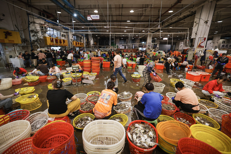 8月12日,商家在舟山沈家門舟山國際水產(chǎn)城內(nèi)分揀、綁扎當天到港的梭子蟹。