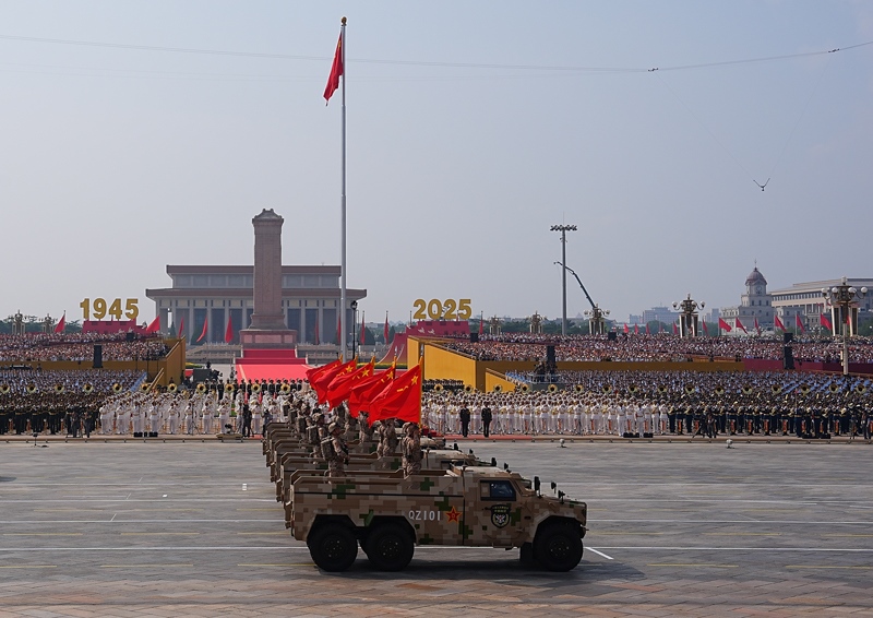 9月3日,紀(jì)念中國(guó)人民抗日戰(zhàn)爭(zhēng)暨世界反法西斯戰(zhàn)爭(zhēng)勝利80周年大會(huì)在北京隆重舉行。這是戰(zhàn)旗方隊(duì)行進(jìn)在長(zhǎng)安街上。