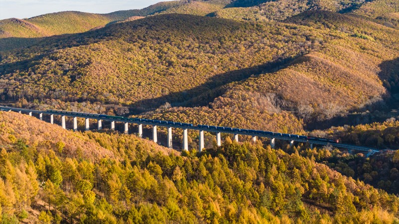 10月18日,一列滿載進(jìn)口物資的貨物列車駛向中國鐵路哈爾濱局集團有限公司綏芬河站(無人機照片)。