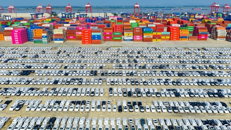 2025年10月4日在江蘇省港口集團(tuán)南京港龍?zhí)陡蹍^(qū)拍攝的準(zhǔn)備裝船出口的汽車(無人機照片)。新華社發(fā)(楊素平?攝)
