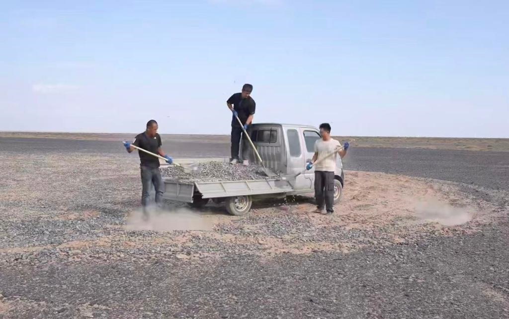 “看到車輪碾過標(biāo)語那一刻,就像碾在歷史的脊梁上。”網(wǎng)絡(luò)博主陸遙得知標(biāo)語被破壞后,主動驅(qū)車兩千多公里,經(jīng)歷六天抵達(dá)哈密。他和朋友們拉運(yùn)20噸砂石,才終于修復(fù)這些“疤痕”。