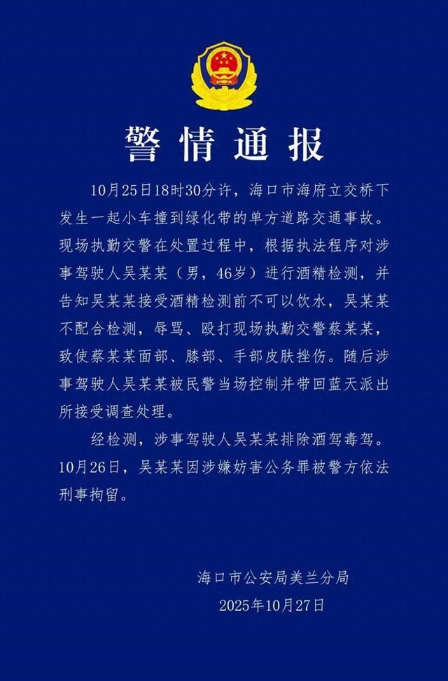 經(jīng)檢測,涉事駕駛?cè)藚悄衬撑懦岂{毒駕。10月26日,吳某某因涉嫌妨害公務(wù)罪被警方依法刑事拘留。