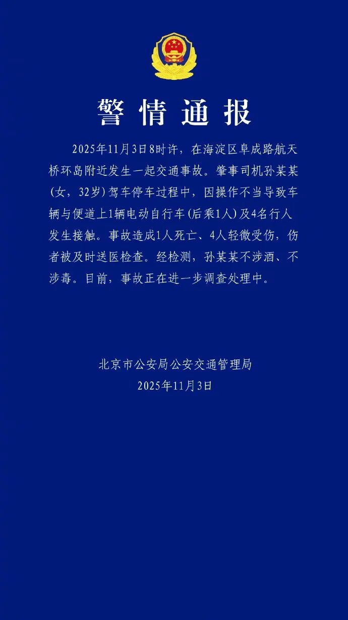 中國(guó)網(wǎng)11月3日訊 11月3日,北京交警發(fā)布通報(bào),當(dāng)日8時(shí)許,在海淀區(qū)阜成路航天橋環(huán)島附近發(fā)生一起交通事故。肇事司機(jī)孫某某(女,32歲)駕車停車過程中,因操作不當(dāng)導(dǎo)致車輛與便道上1輛電動(dòng)自行車(后乘1人)及4名行人發(fā)生接觸。事故造成1人死亡、4人輕微受傷,傷者被及時(shí)送醫(yī)檢查。經(jīng)檢測(cè),孫某某不涉酒、不涉毒。目前,事故正在進(jìn)一步調(diào)查處理中。