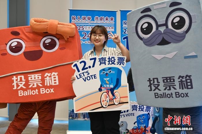 10月23日,香港特區(qū)政府和選舉管理委員會(huì)舉行2025年立法會(huì)換屆選舉啟動(dòng)禮,為第八屆立法會(huì)選舉揭開序幕。圖為一名女士與“票箱家族”角色合影。 中新社記者 李志華 攝