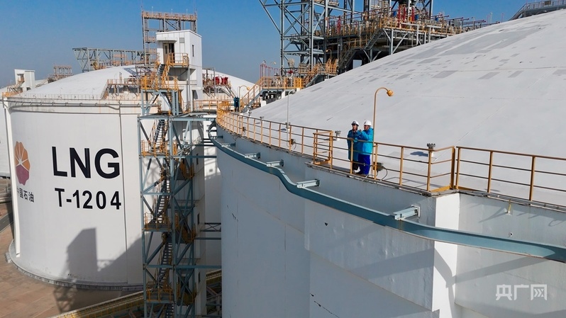 記者和采訪對(duì)象站在20萬立方米的LNG儲(chǔ)罐上(央廣網(wǎng)記者 楊夢奎 攝)