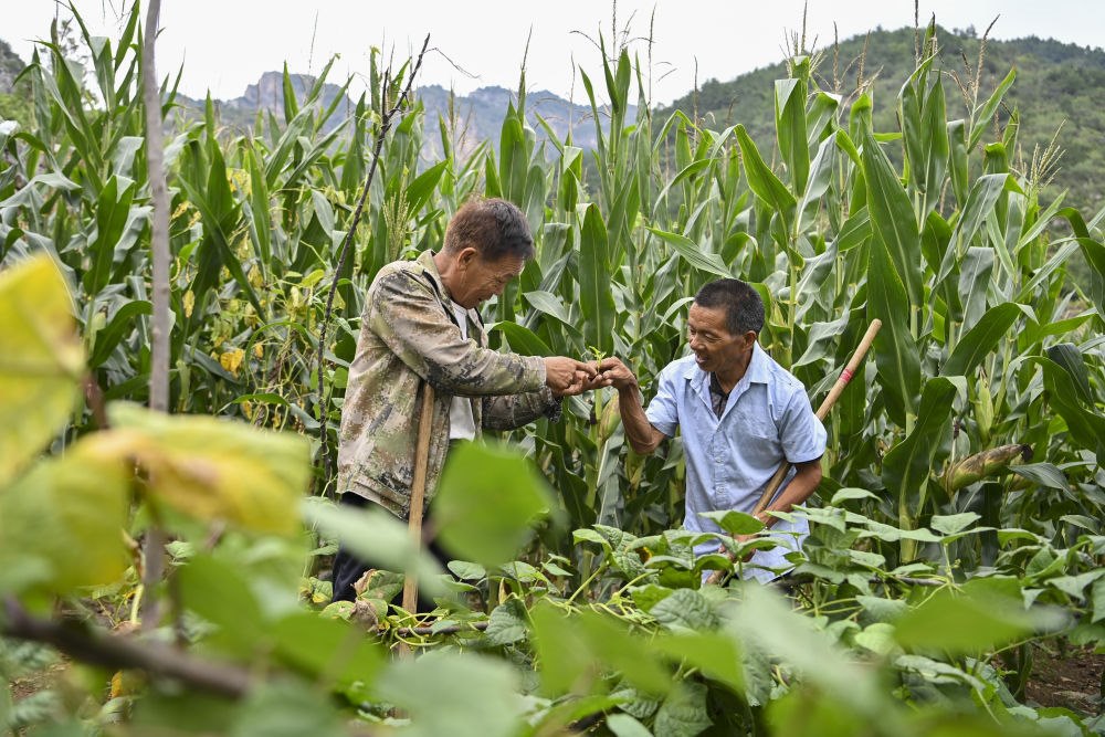 ↑村民桑建平(左)通過手勢(shì)告訴秦海松野草和蔬菜的區(qū)別(2025年8月27日攝)。