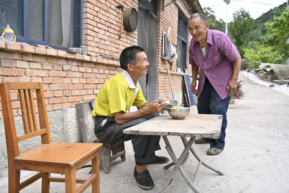 ↑村民元有才(右)為秦海松準(zhǔn)備好午餐后,兩人開心交流(2025年8月6日攝)。