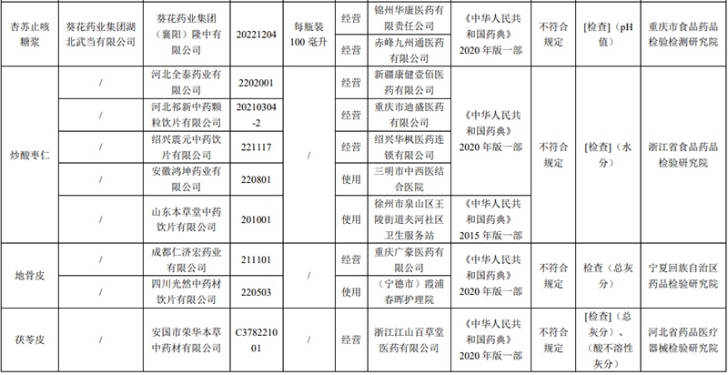經(jīng)寧夏回族自治區(qū)藥品檢驗研究院檢驗,標(biāo)示為成都仁濟宏藥業(yè)有限公司、四川光然中藥材飲片有限公司生產(chǎn)的2批次地骨皮不符合規(guī)定,不符合規(guī)定項目為總灰分。