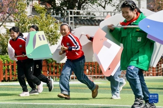 3月31日,徐州市漢橋小學(xué)的學(xué)生進(jìn)行“列車(chē)競(jìng)速”游戲。