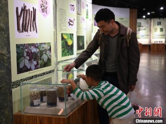 嚴進軍帶著6歲的兒子參觀中醫(yī)藥博物館。張瑤 攝