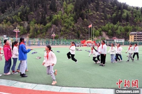 5月17日,四川阿壩州壤塘縣寄宿制學(xué)校的學(xué)生在操場跳繩。中新社記者 安源 攝