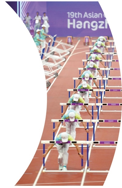 杭州奧體中心體育場內,志愿者在田徑項目女子七項全能100米欄比賽前準備場地。 新華社記者 江文耀攝