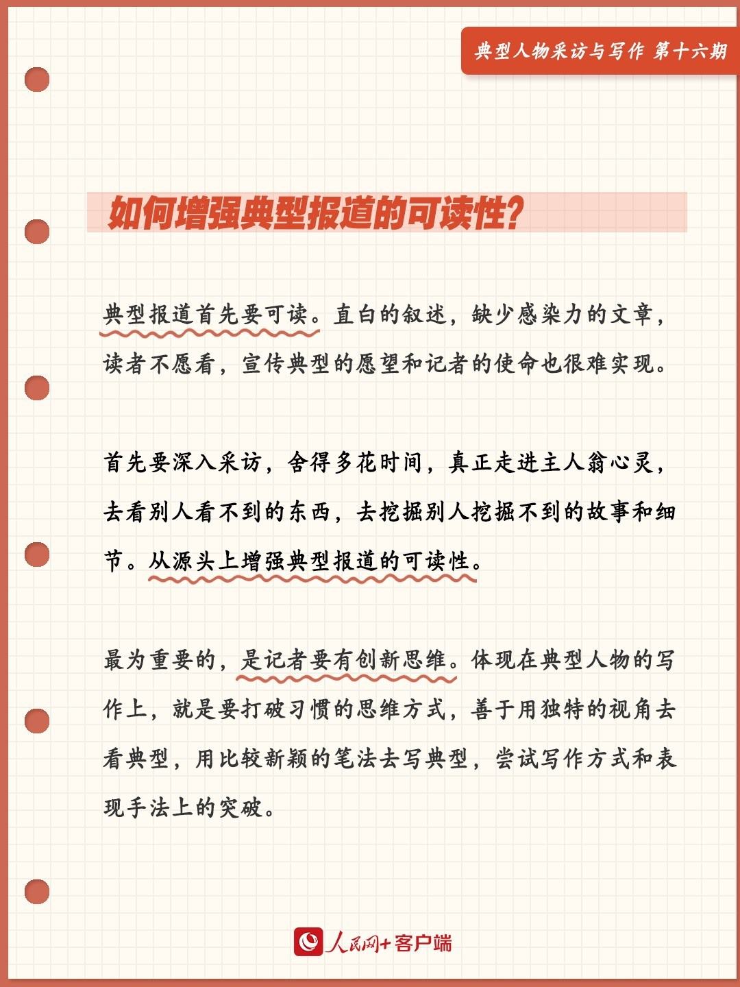 提要:創(chuàng)新思維最為重要。典型人物寫作要打破習慣思維方式,善于用獨特的視角去看典型,用比較新穎的筆法去寫典型,嘗試寫作方式和表現(xiàn)手法上的突破。有新意,便可讀??勺x性強,才容易引起共鳴。
