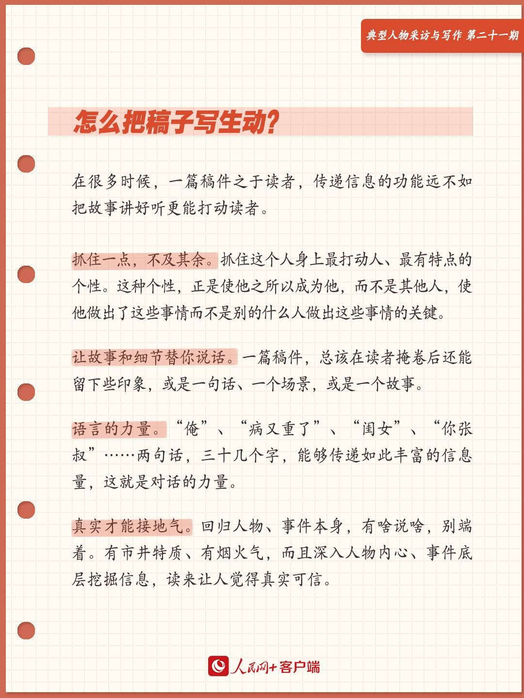 抓住一點,不及其余。副縣長、信訪局長、基層民警、環(huán)衛(wèi)局長……這些被評為“人民滿意的公務(wù)員”的采訪對象,每個人身上都有一串光榮事跡,若是有聞必錄,大概寫五六千字也打不住。怎樣在千字內(nèi)把故事講好,讓采訪對象躍然紙上?