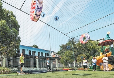 清晨,在江西省萍鄉(xiāng)市上栗縣赤山鎮(zhèn)中心小學(xué)操場上,一場別開生面的無人機(jī)足球?qū)官惣?zhàn)正酣。王方遒航模隊(duì)的6名隊(duì)員,熟練地操作著遙控器,足球形狀外殼包裹的無人機(jī)在空中快速移動(dòng),攻防、躲避、射門……“足球”穿梭飛舞,隊(duì)員們神情專注。