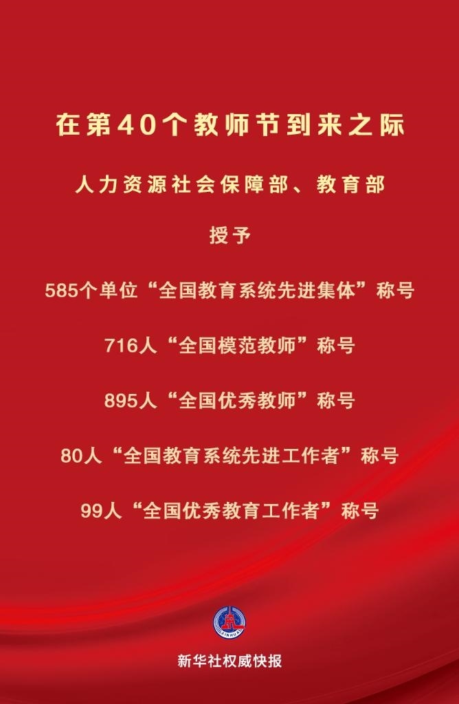 在中華人民共和國成立75周年和第40個教師節(jié)到來之際,為大力弘揚(yáng)教育家精神,營造全社會尊師重教濃厚氛圍,激勵全國廣大教師和教育工作者落實立德樹人根本任務(wù),積極投身教育強(qiáng)國建設(shè),人力資源社會保障部、教育部決定授予中央財經(jīng)大學(xué)金融學(xué)院等585個單位“全國教育系統(tǒng)先進(jìn)集體”稱號;授予刁榮春等716名同志“全國模范教師”稱號;授予于淵等895名同志“全國優(yōu)秀教師”稱號;授予王彥平等80名同志“全國教育系統(tǒng)先進(jìn)工作者”稱號;授予王軍等99名同志“全國優(yōu)秀教育工作者”稱號。