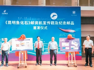 2023年5月,《昆明魚化石》郵資機(jī)宣傳戳及系列紀(jì)念郵品在西北大學(xué)博物館首發(fā)。此次啟用的《昆明魚化石》郵資機(jī)宣傳戳,是以中國(guó)科學(xué)院院士、西北大學(xué)教授舒德干團(tuán)隊(duì)發(fā)現(xiàn)的鳳姣昆明魚化石為原型設(shè)計(jì)制作。鳳姣昆明魚距今已5.18億年,是已知最古老的脊椎動(dòng)物。該魚的發(fā)現(xiàn),為揭示寒武紀(jì)大爆發(fā)奧秘、破解遠(yuǎn)古生命演化謎團(tuán)提供了獨(dú)特的劃時(shí)代里程碑證據(jù)。圖為首發(fā)儀式現(xiàn)場(chǎng)。中新社發(fā)