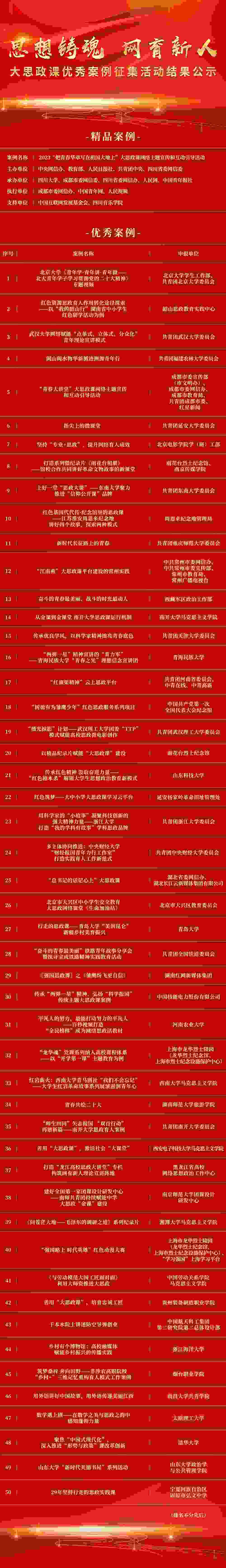 由中央網(wǎng)信辦網(wǎng)絡(luò)傳播局、共青團(tuán)中央宣傳部指導(dǎo),人民網(wǎng)、中國青年報(bào)社共同主辦的“思想鑄魂 網(wǎng)育新人”大思政課優(yōu)秀案例征集活動(dòng)評選結(jié)果已經(jīng)產(chǎn)生,現(xiàn)對擬入選案例進(jìn)行公示,公示時(shí)間為1月20日至1月24日,公示期間歡迎社會(huì)各界監(jiān)督評議,有關(guān)意見可發(fā)送至郵箱eduyouth@163.com,我們將及時(shí)受理、認(rèn)真核查,公示期滿后將適時(shí)對外發(fā)布最終結(jié)果。