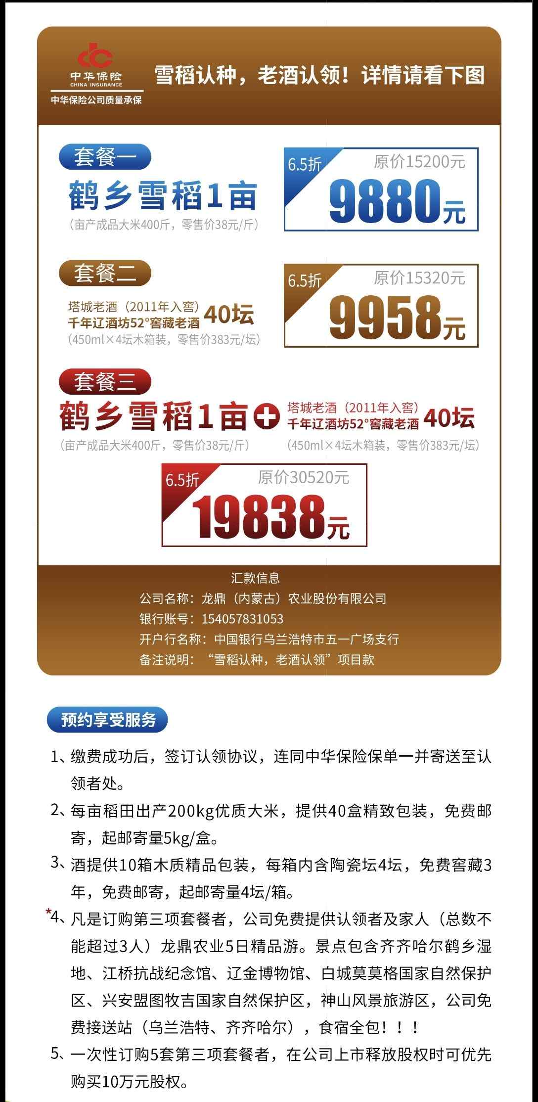 目前,“雪稻認種、老酒認領”共有三種認領套餐(如圖),認領第三種套餐,全家可享有龍鼎農業(yè)5日深度精品游,景點包含齊齊哈爾鶴鄉(xiāng)濕地、江橋抗戰(zhàn)紀念館、遼金博物館、白城莫莫格國家自然保護區(qū)、興安盟圖牧吉國家自然保護區(qū)、神山風景旅游區(qū),公司免費接送站(烏蘭浩特、齊齊哈爾) ,食宿全包。