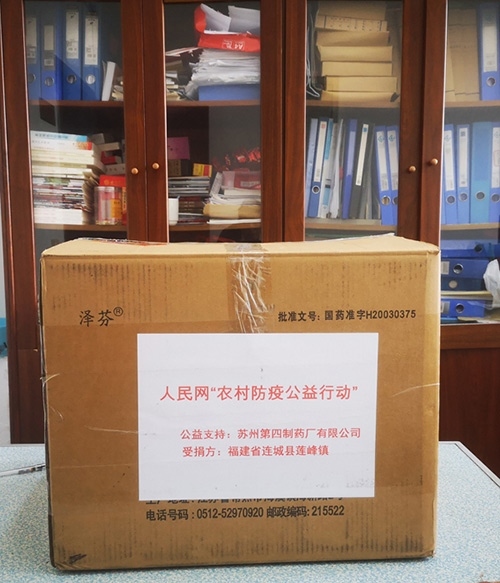 福建省連城縣蓮峰鎮(zhèn)收到蘇州第四制藥廠通過人民網(wǎng)“防疫互助平臺”捐贈的右布洛芬膠囊。曾金水攝