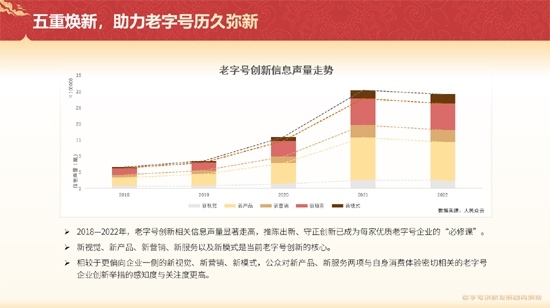 《報告》基于近五年傳播與實(shí)體數(shù)據(jù)信息,綜合運(yùn)用全量及抽樣分析方法,洞察老字號五大創(chuàng)新發(fā)展趨勢,分析老字號在創(chuàng)新過程中暴露出的不足,并提出針對性建議舉措。