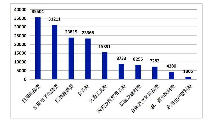 從商品和服務(wù)類別來看,在所有投訴中,商品類投訴為159143件,占總投訴量的52.32%,與去年同期相比,比重上升0.29個(gè)百分點(diǎn);服務(wù)類投訴為137726件,占總投訴量的45.28%,比重上升0.87個(gè)百分點(diǎn);其他類投訴為7290件,占總投訴數(shù)量的2.40%。