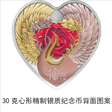 30克心形銀質(zhì)“比翼雙飛”紀(jì)念幣背面圖案為雙鳥、玫瑰、百合等裝飾組合圖案,并刊“比翼雙飛”字樣及面額。