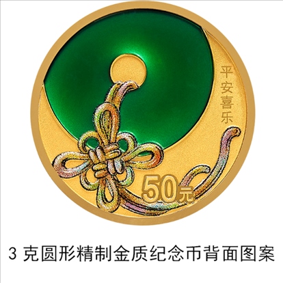3克圓形金質(zhì)“平安喜樂”紀(jì)念幣背面圖案為平安扣、中國(guó)結(jié)裝飾組合圖案,并刊“平安喜樂”字樣及面額。