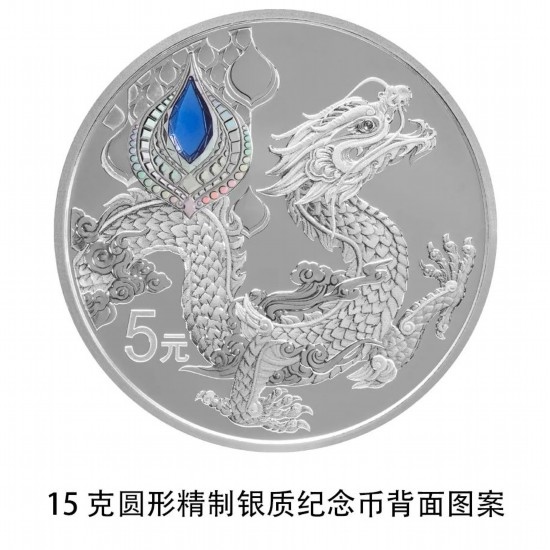 15克圓形銀質(zhì)紀(jì)念幣背面圖案為龍?jiān)煨?,并刊面額。