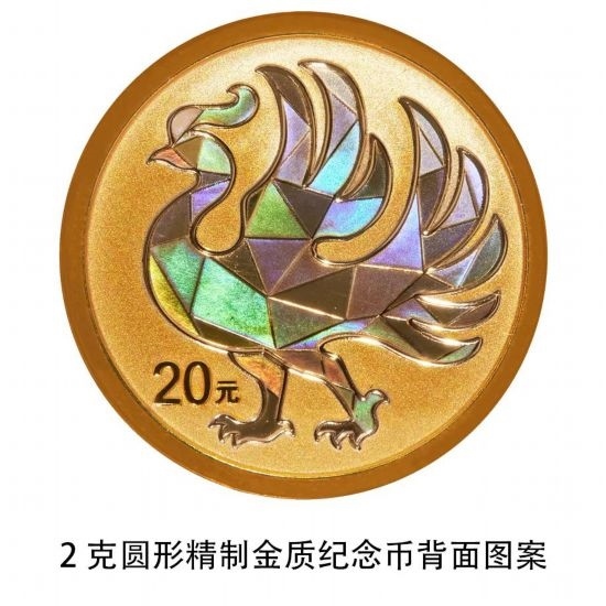 2克圓形金質(zhì)紀(jì)念幣背面圖案為裝飾鳳凰造型,并刊面額。