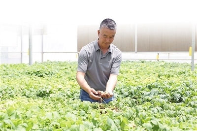 定西馬鈴薯研究所負(fù)責(zé)人李進(jìn)福在查看馬鈴薯原原種長勢。本報記者 王錦濤攝