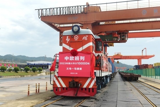7月29日,隨著滿載110個標(biāo)箱出口貨物的X8020次中歐班列從鐵路義烏西站緩緩開出前往西班牙馬德里,2023年中歐班列累計開行已達(dá)1萬列,較去年提前22天破萬列;發(fā)送貨物108.3萬標(biāo)準(zhǔn)箱,同比增長27%。