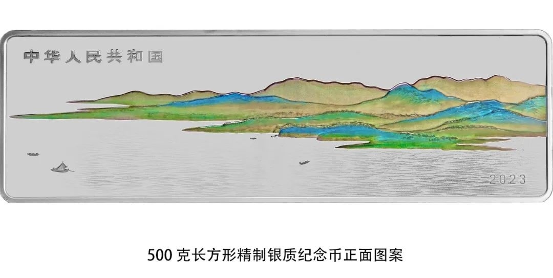 500克長方形銀質(zhì)紀念幣正面圖案為山、水等組合設計,并刊國名、年號。