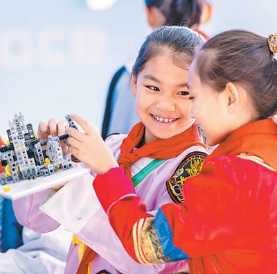 內(nèi)蒙古呼和浩特市,小學(xué)生在校學(xué)習(xí)組裝機器人。丁根厚攝(影像中國)