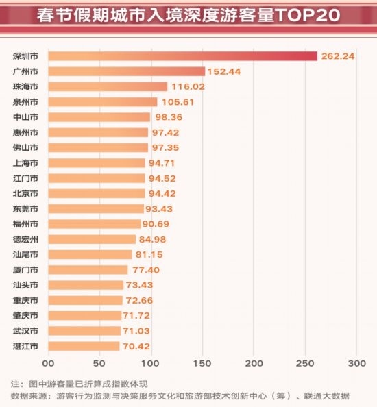珠三角城市接待入境游客量高。春節(jié)假期,入境游客大數(shù)據(jù)樣本顯示,入境深度游客量前3的城市均為珠三角城市,珠三角9個城市均位列入境游深度游客量前20,珠三角城市入境深度游客量達(dá)到抽樣總體樣本的三分之一以上。