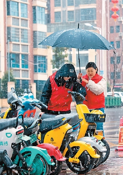 江西省贛州市興國縣長(zhǎng)征社區(qū)志愿者在網(wǎng)格區(qū)整理共享單車。陳鵬攝(人民視覺)