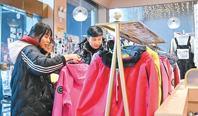 游客在湖北神農(nóng)架林區(qū)木魚鎮(zhèn)一家店鋪挑選雪具雪服。