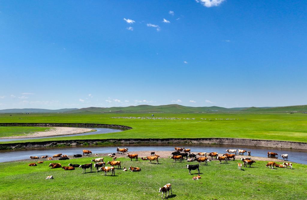 以上圖片:2025年7月13日在內(nèi)蒙古自治區(qū)呼倫貝爾市陳巴爾虎旗境內(nèi)拍攝的莫爾格勒河風(fēng)光。(無人機(jī)照片)CICPHOTO/王正